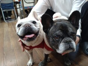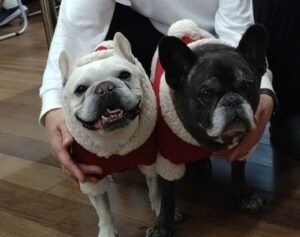 可愛いワンちゃんサンタたちも見守る中、美味しいケーキを囲んで、